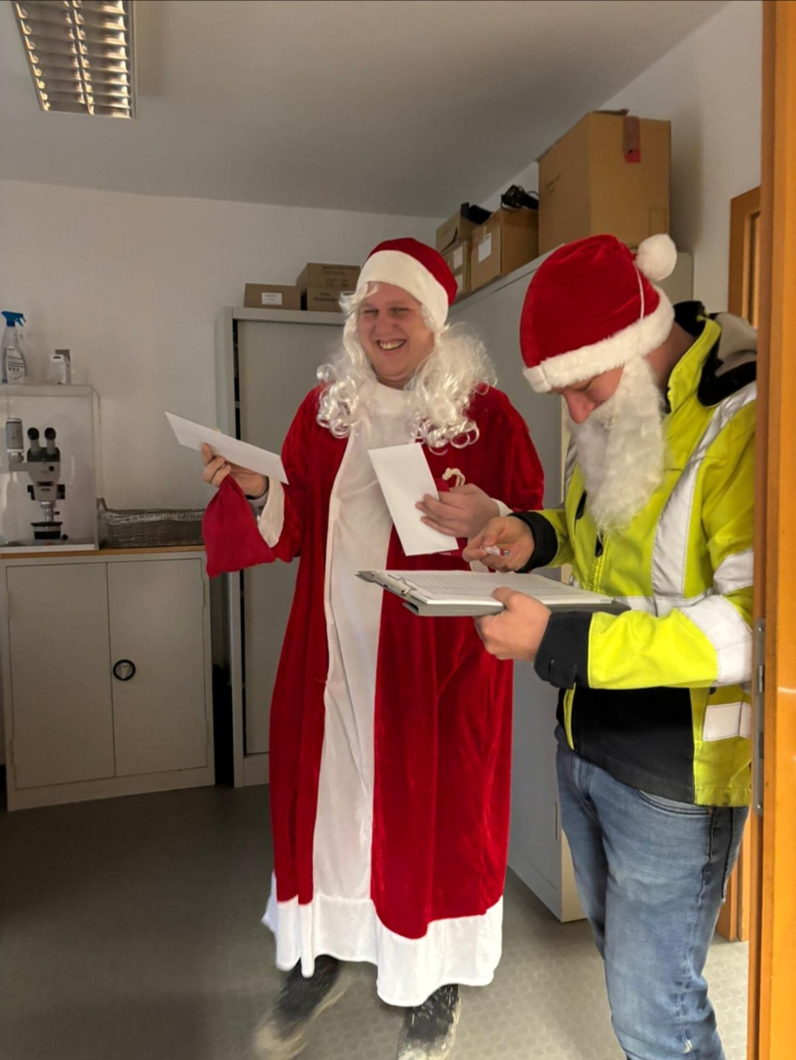 Denn was die Firma als kleines Weihnachtspräsent bestellt hatte, wurde nicht einfach „ausgegeben“. Nein. Der Werksleiter und sein Stellvertreter entschieden sich für die Premium-Variante: Verteilung im Kostüm, mit der Sorte Auftritt, bei der selbst der letzte „Ich bin nur kurz hier“-Kollege unweigerlich grinsen muss. Und während die Mummel-Beutel die Hände wechselten, wechselte im Werk die Atmosphäre von „Freitag, letzte Aufgaben“ zu „Freitag, jetzt wird’s festlich“.