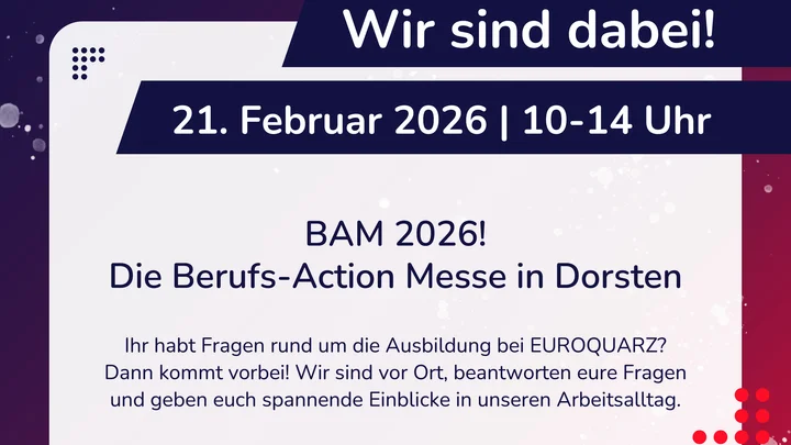 Du willst wissen, welche Ausbildungsberufe es bei EUROQUARZ gibt, wie der Arbeitsalltag aussieht und welche Chancen sich nach der Ausbildung bieten? Dann komm an unserem Stand vorbei und sprich direkt mit uns. 🚀