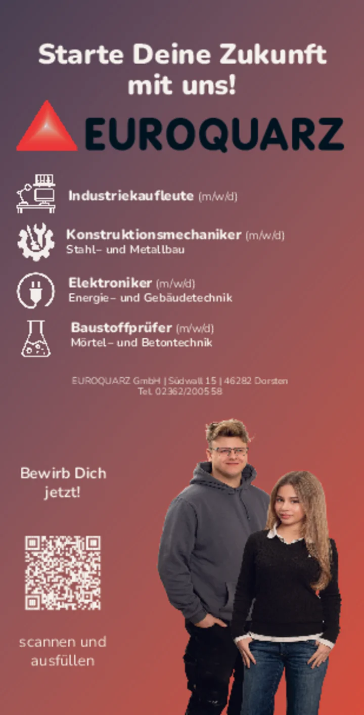 Unsere heutigen Auszubildenden sind in den Zweitausendern geboren – alles andere als geburtenstarke Jahrgänge. Mehr denn je konkurrieren heute die Unternehmen um den potenziellen Nachwuchs. Daher bauen wir die Intensität und Qualität der Ausbildung bei EUROQUARZz noch weiter aus. Zukünftig drohender Fachkräftemangel erhöht den Druck. Bislang hält EUROQUARZ dem Druck stand und bleibt nie untätig. Beispielsweise sind wir demnächst wieder auf der Ausbildungsmesse der Schulen vertreten.